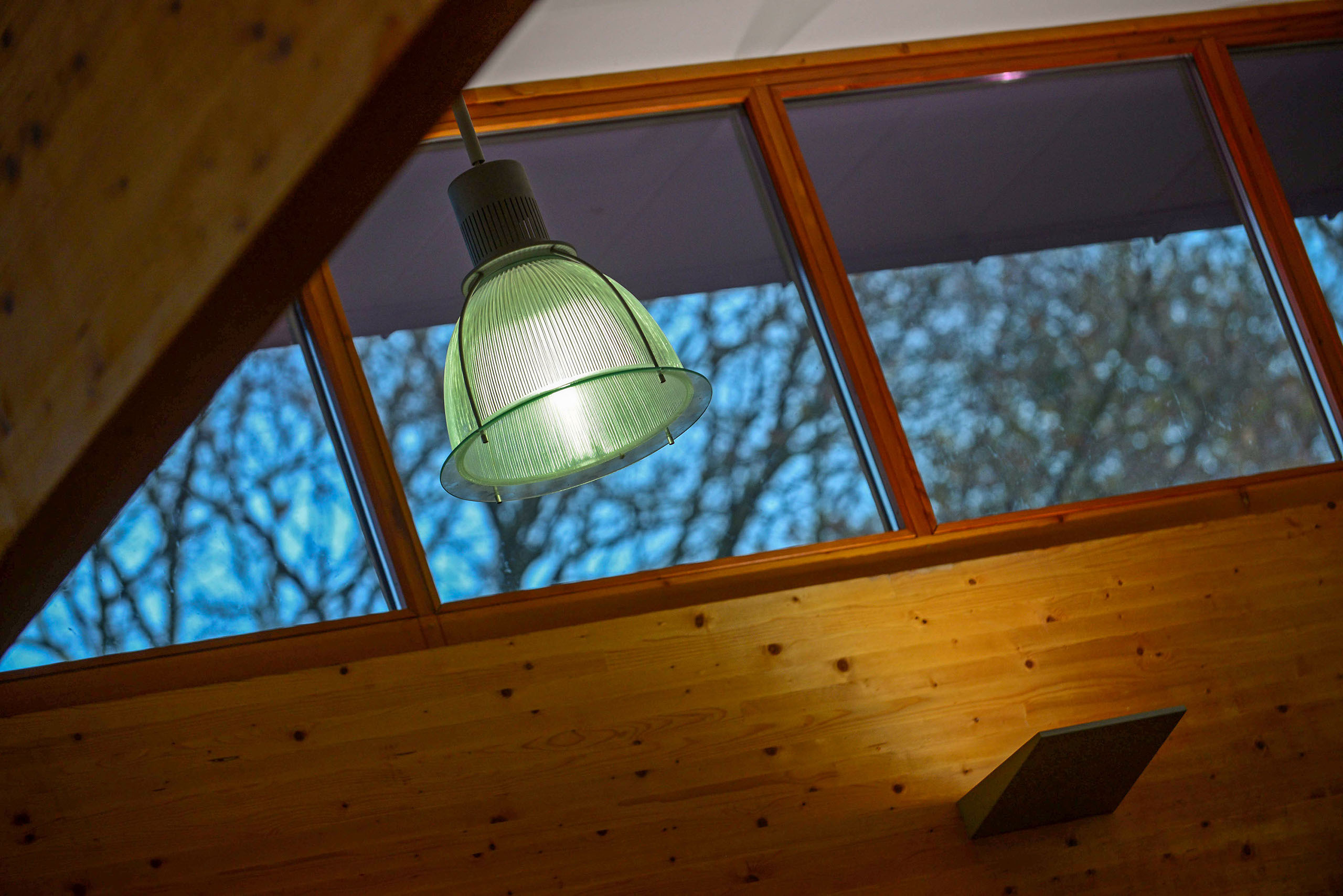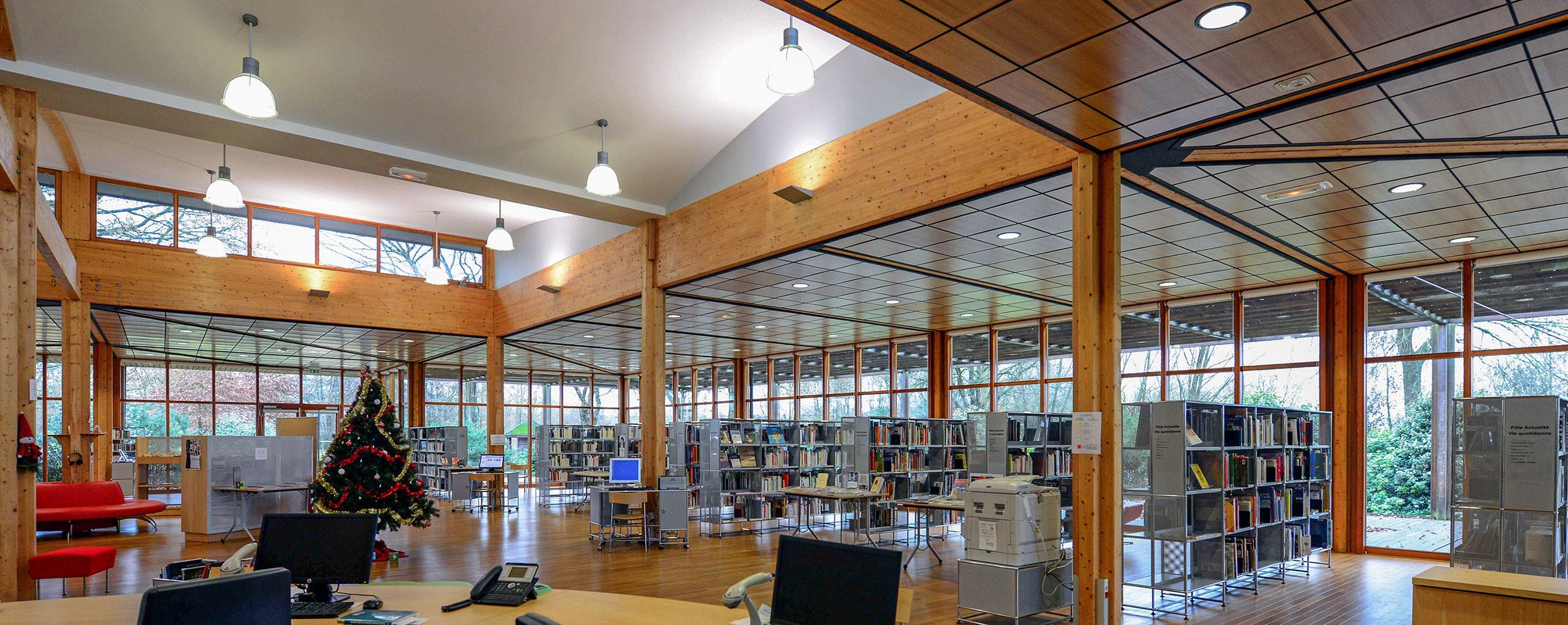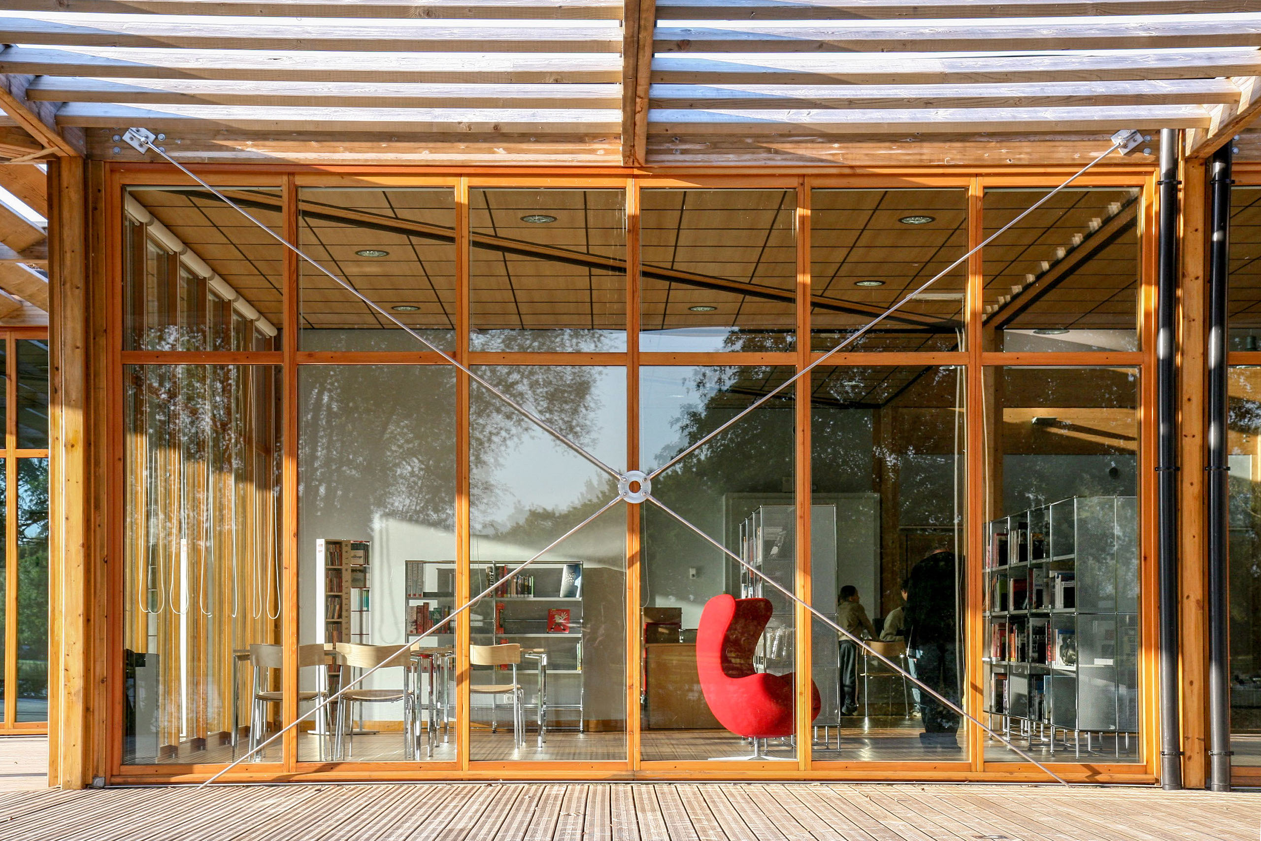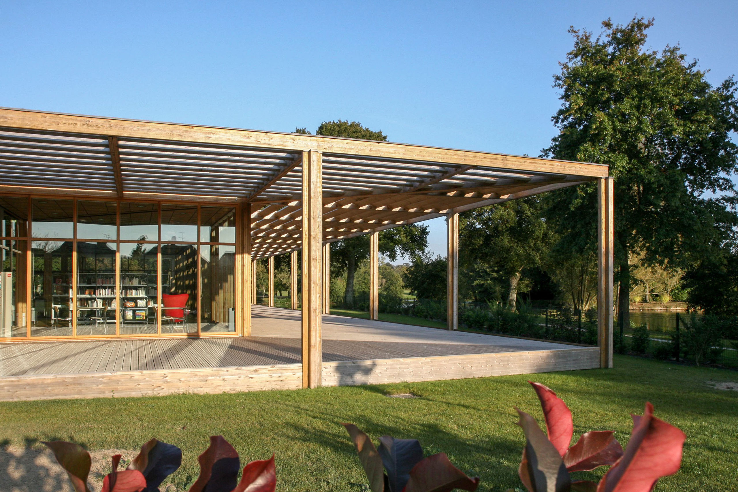 Ce kiosque, légèrement surélevé, par rapport au terrain naturel est réalisé entièrement en ossature bois avec des panneaux de bois tramés et de larges ouvertures scandées par un rythme de montants verticaux.