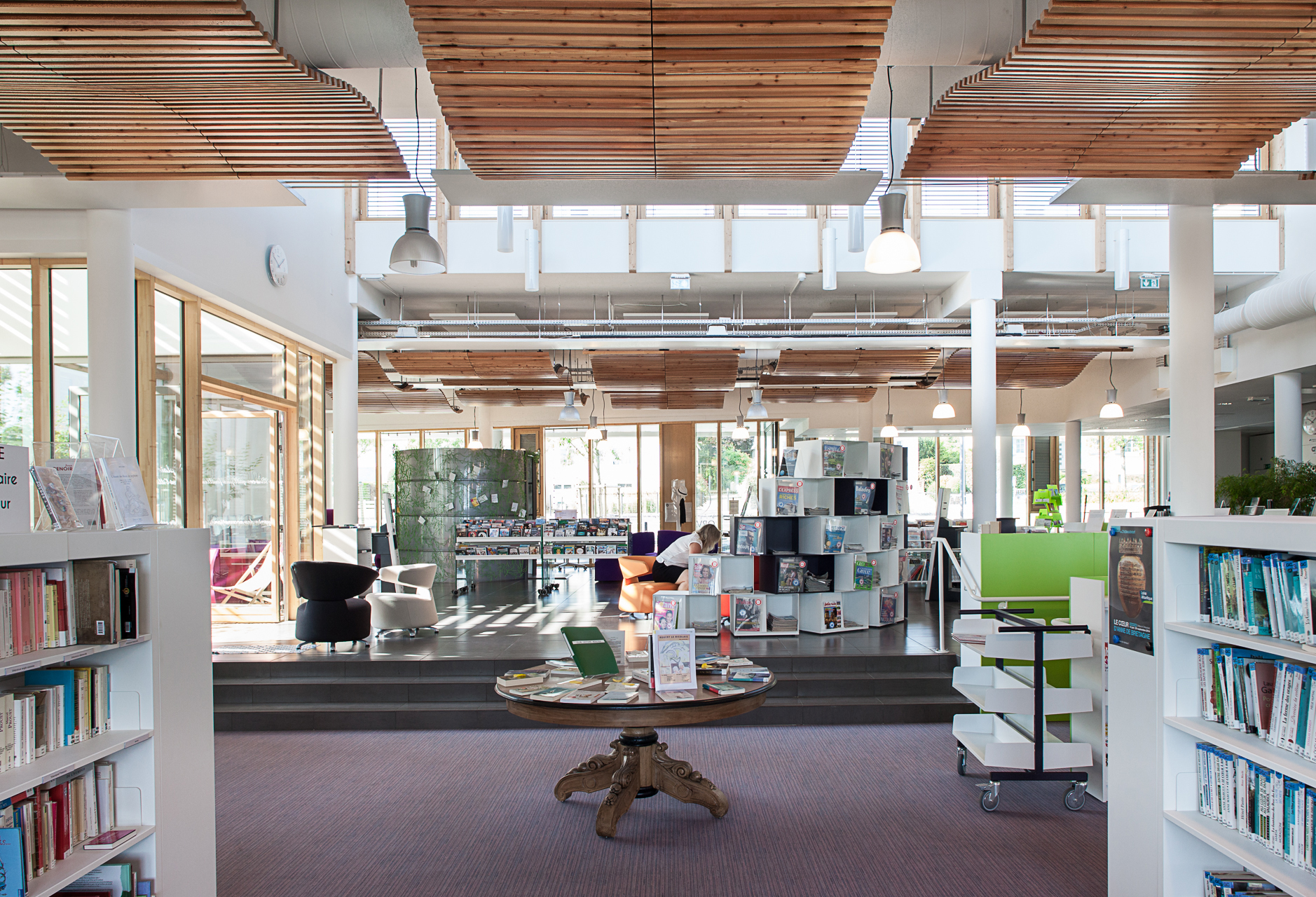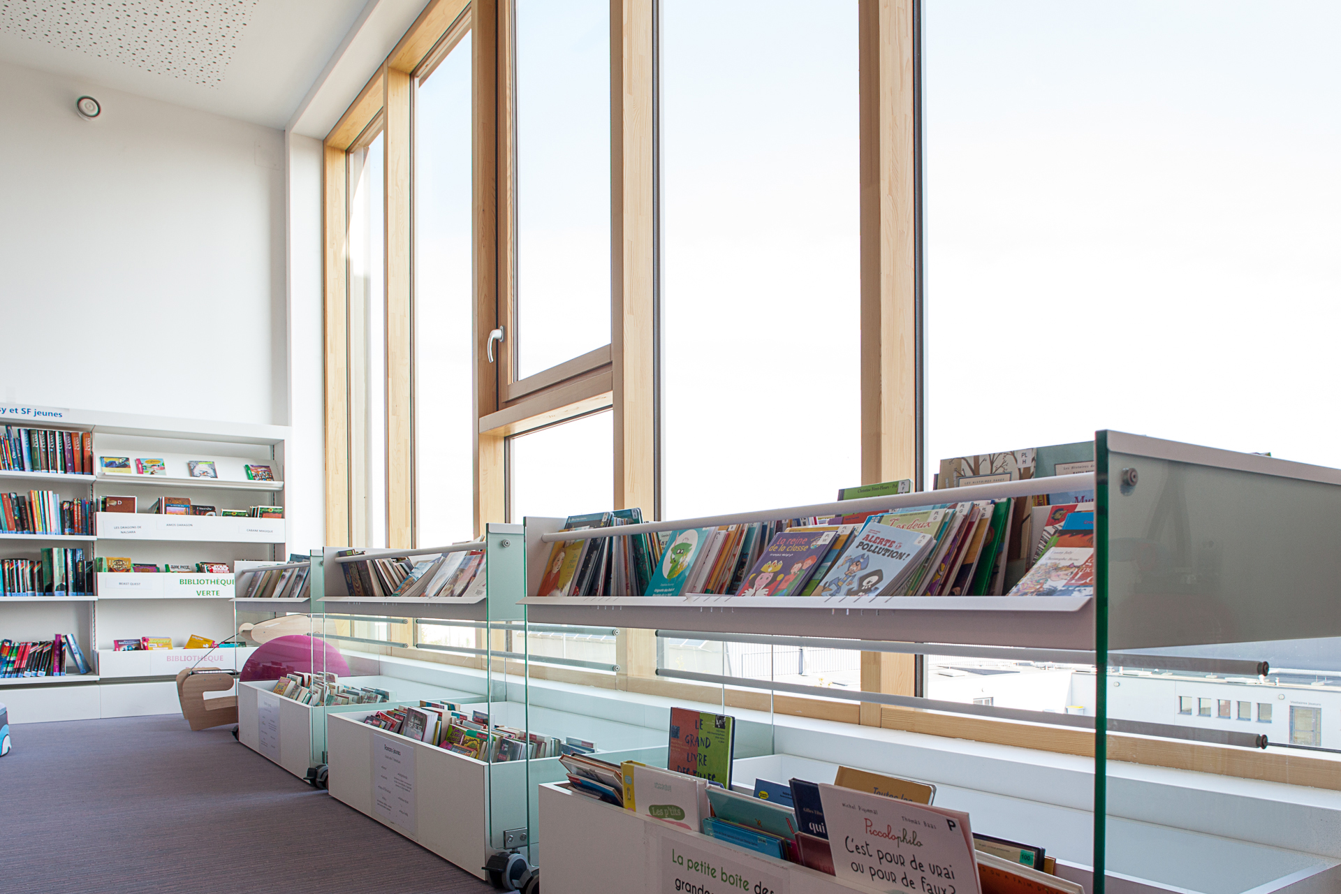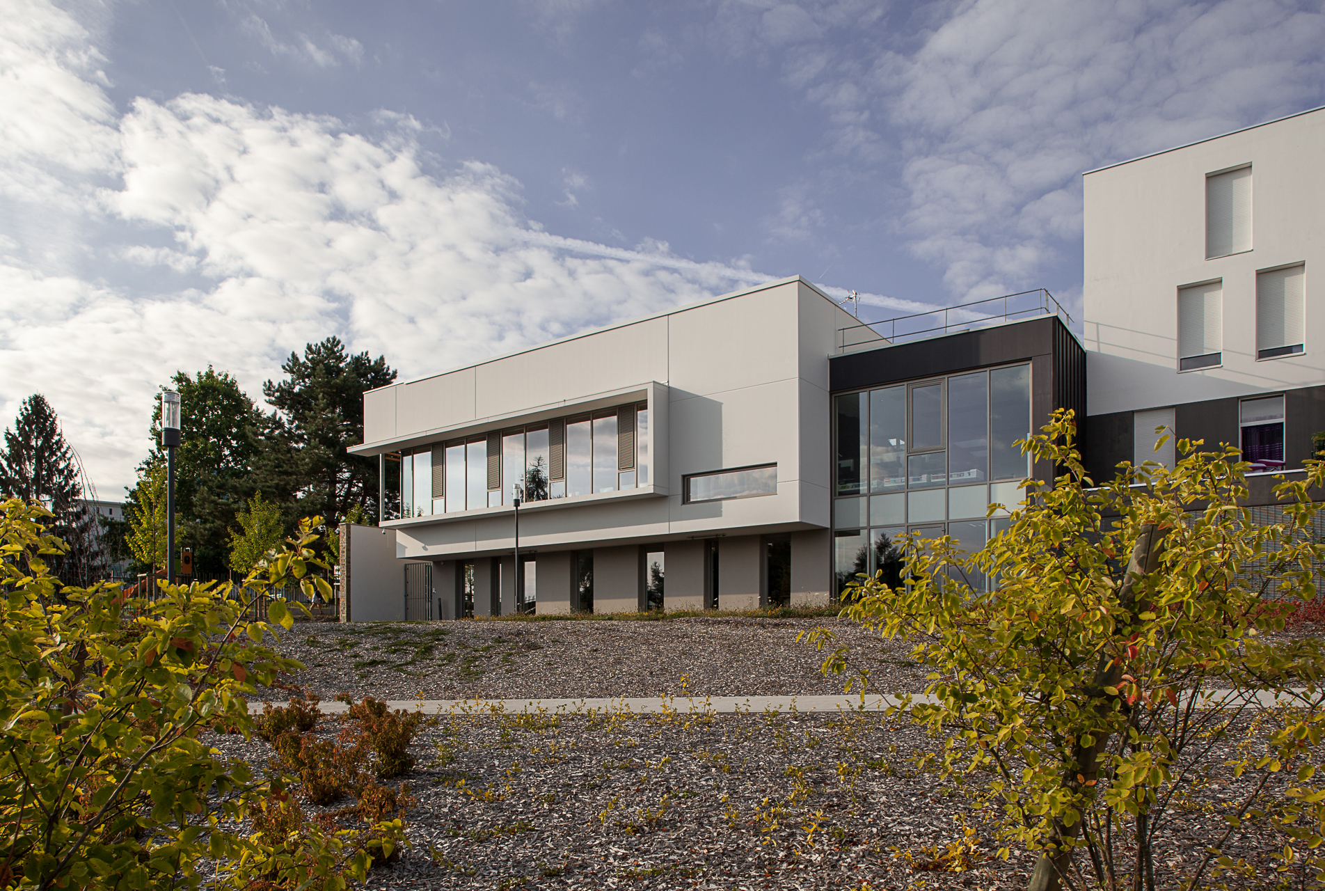 Le bâtiment s’ouvre par une façade largement vitrée au sud sur le mail, protégée par un large auvent.