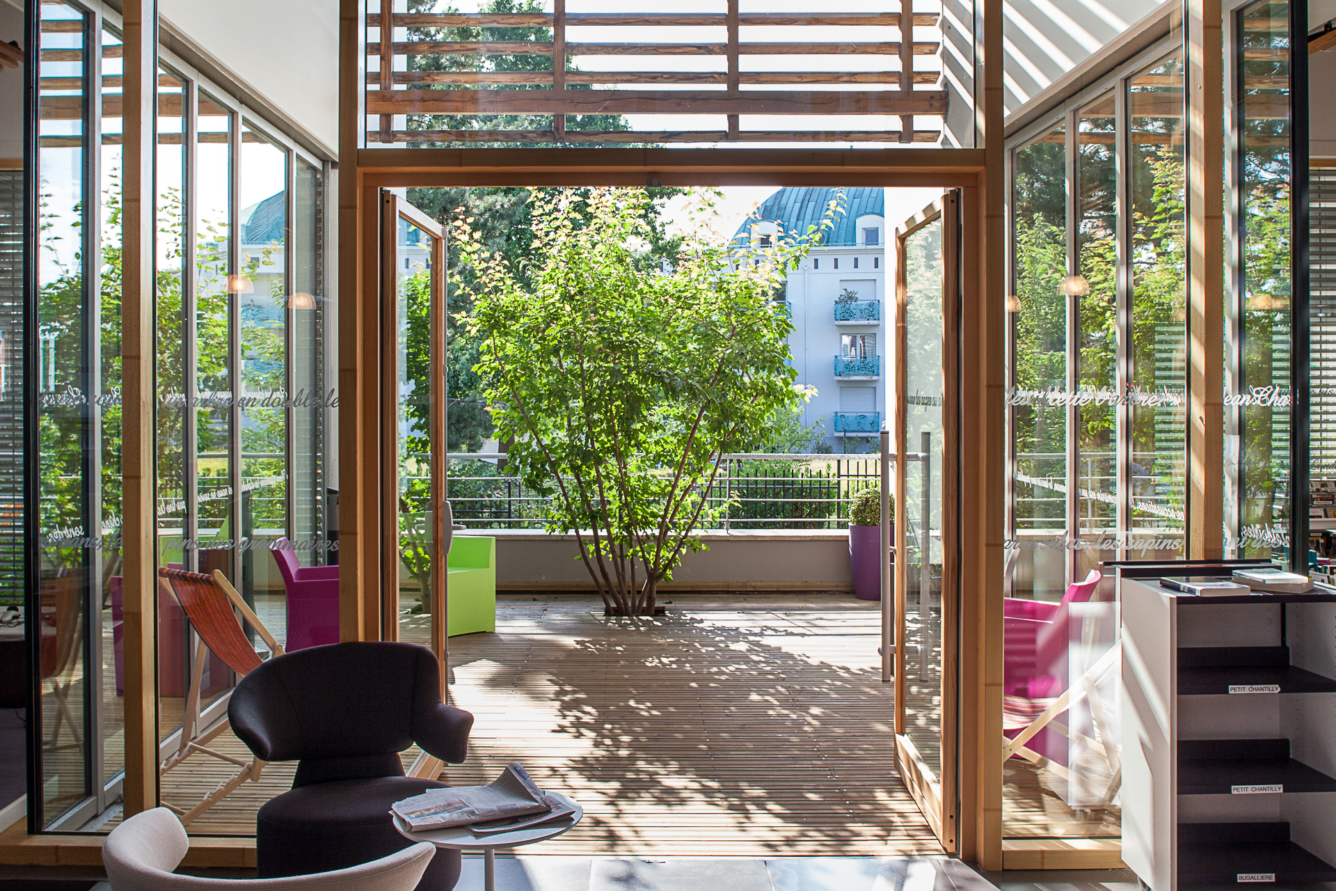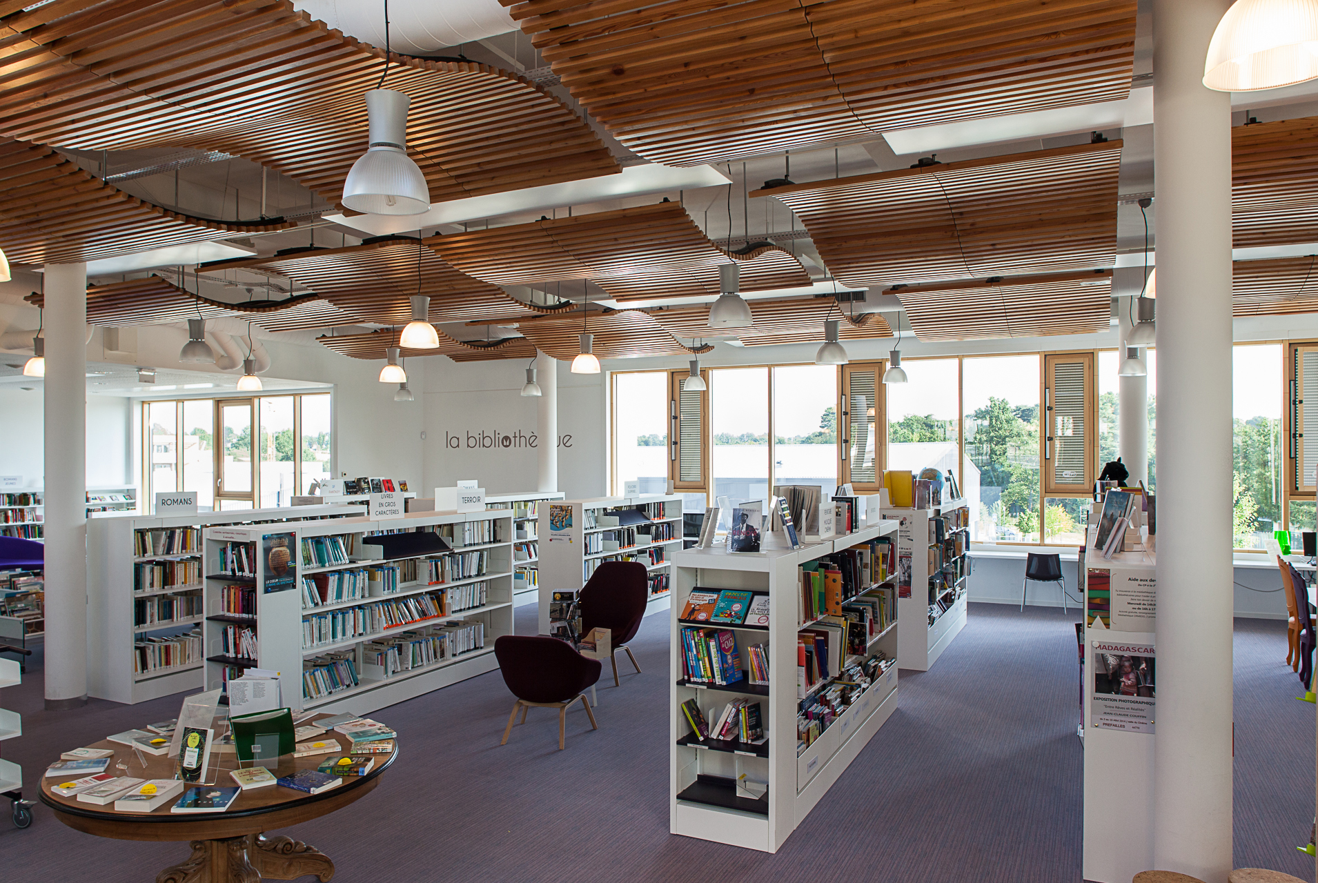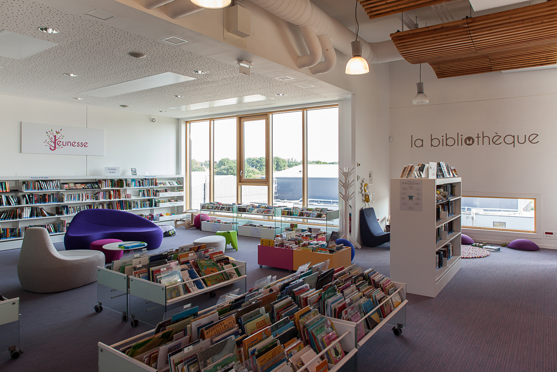 Le bâtiment s’ouvre par une façade largement vitrée au sud sur le mail, protégée par un large auvent.