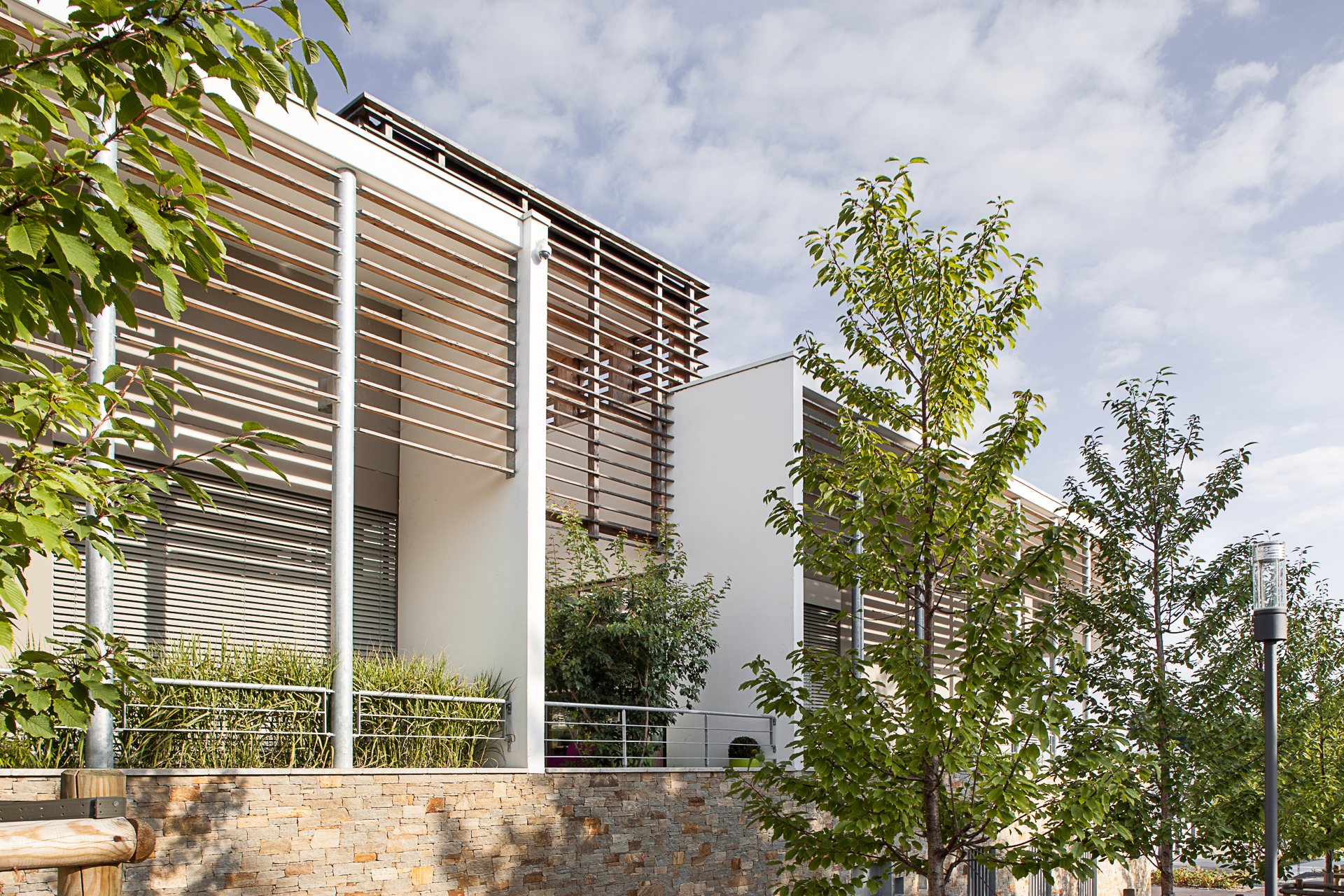Un socle habillé de pierre naturelle à l’est épouse la déclivité du terrain, formant une terrasse planté d’arbuste légers filtrant et préservant la transparence de la façade est, percée de larges baies vitrées protégées par des brises soleil.