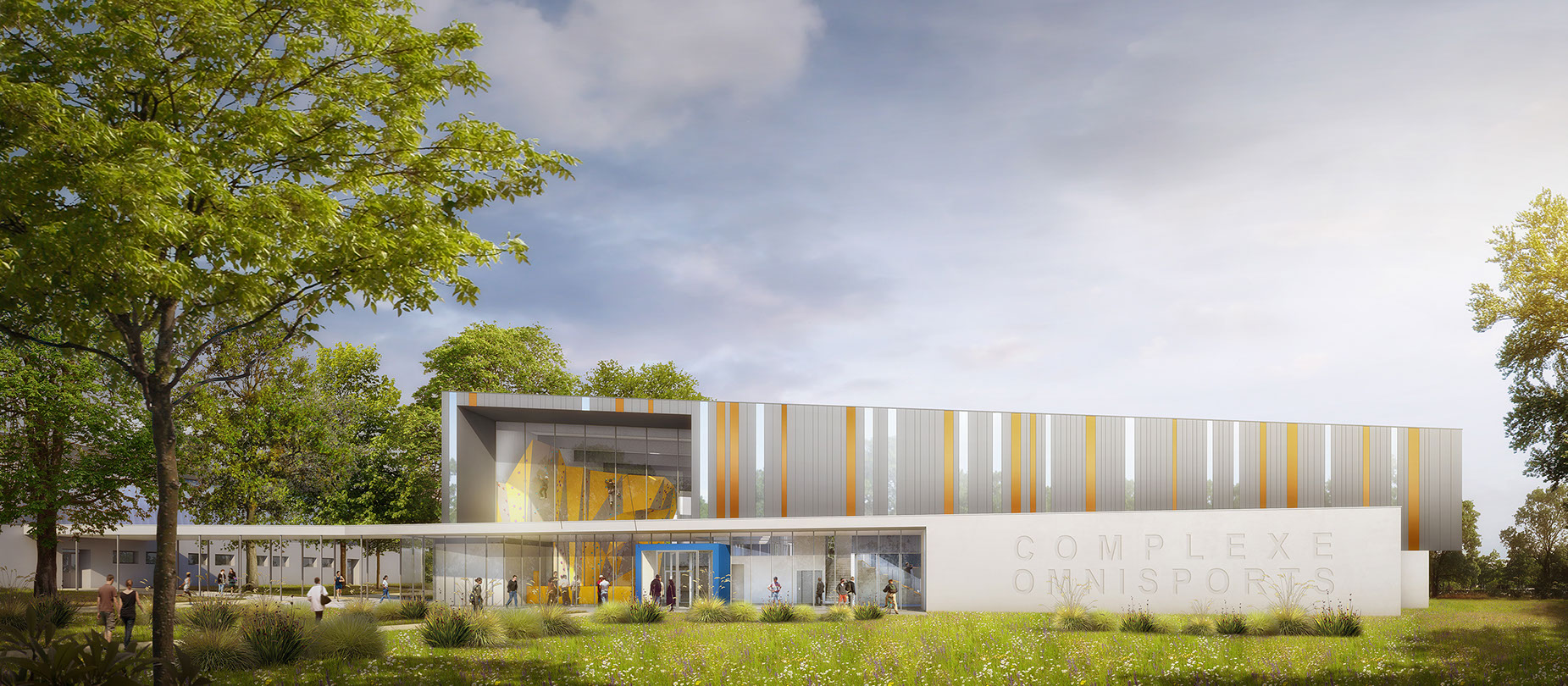 Le volume simple de la salle neuve se pare d’un bardage métallique qui reflète les feuillages. La simplicité de l'architecture favorise la pérennité et la solidité. La transparence s’exprime dès l’entrée avec une large vue depuis l’extérieur sur la salle d’escalade et sur la salle multisports afin de créer une relation forte entre l’intérieur et l’extérieur. Les locaux sont organisés suivant une logique toute fonctionnelle. Au nord proche des stationnements du public s’ouvre l’espace de convivialité. Au cœur du complexe celui ci dessert d’Est en Ouest : le COSEC, l’espace d’escalade, les vestiaires, la salle multisports, et le pôle administratif.