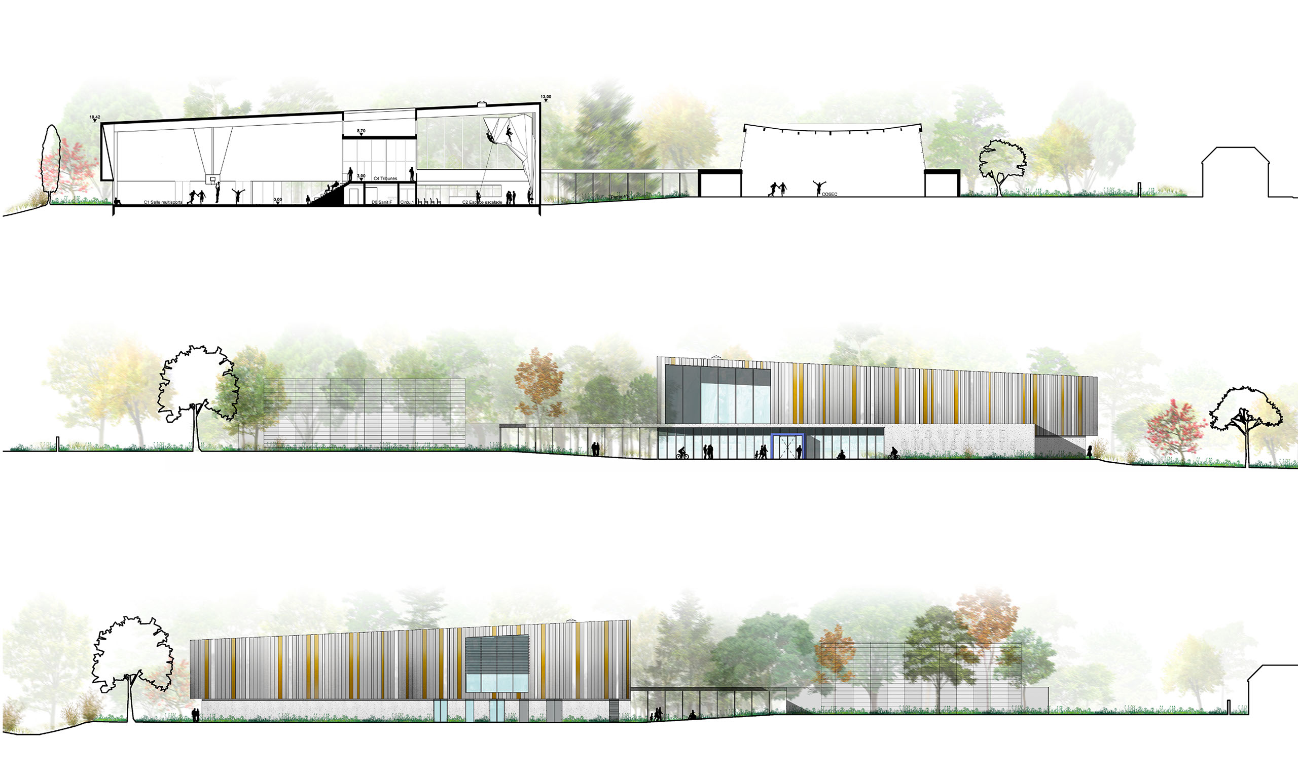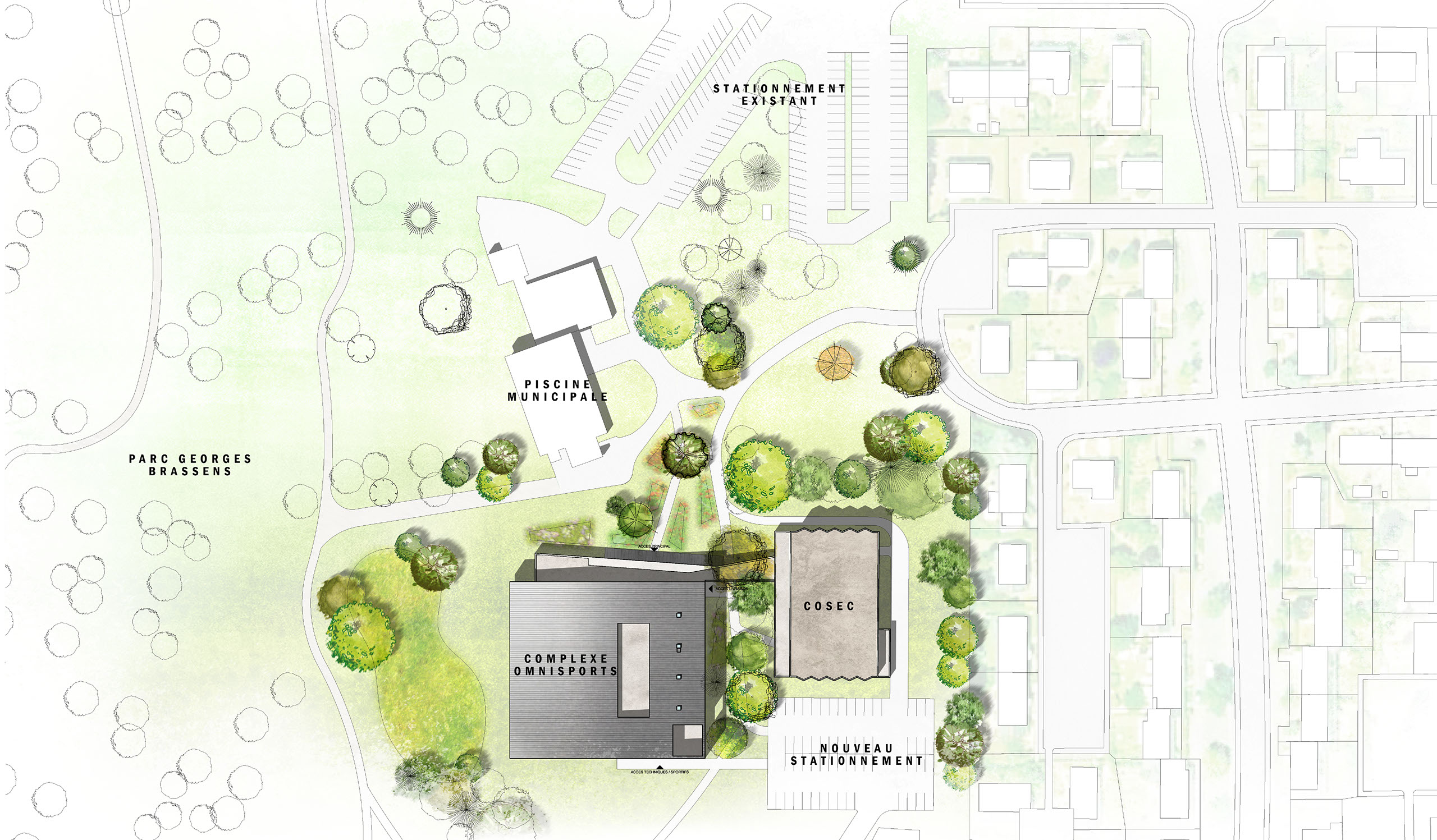 L’intégration du complexe dans le site s’articule autour d’une préoccupation primordiale qui est la préservation d’un maximum d’arbre. Mais c’est aussi la recherche d’un équilibre entre les masses bâties : COSEC et piscine et la préservation de percées visuelles sur le parc. Une liaison bâtie couverte relie le COSEC à l’espace convivialité de la nouvelle salle. Simplicité de fonctionnement, de forme, et transparence sont les idées qui se rattachent le mieux à ce projet. Nous avons voulu exprimer une certaine sobriété architecturale qui fasse la part belle à l’environnement et à la fonctionnalité.