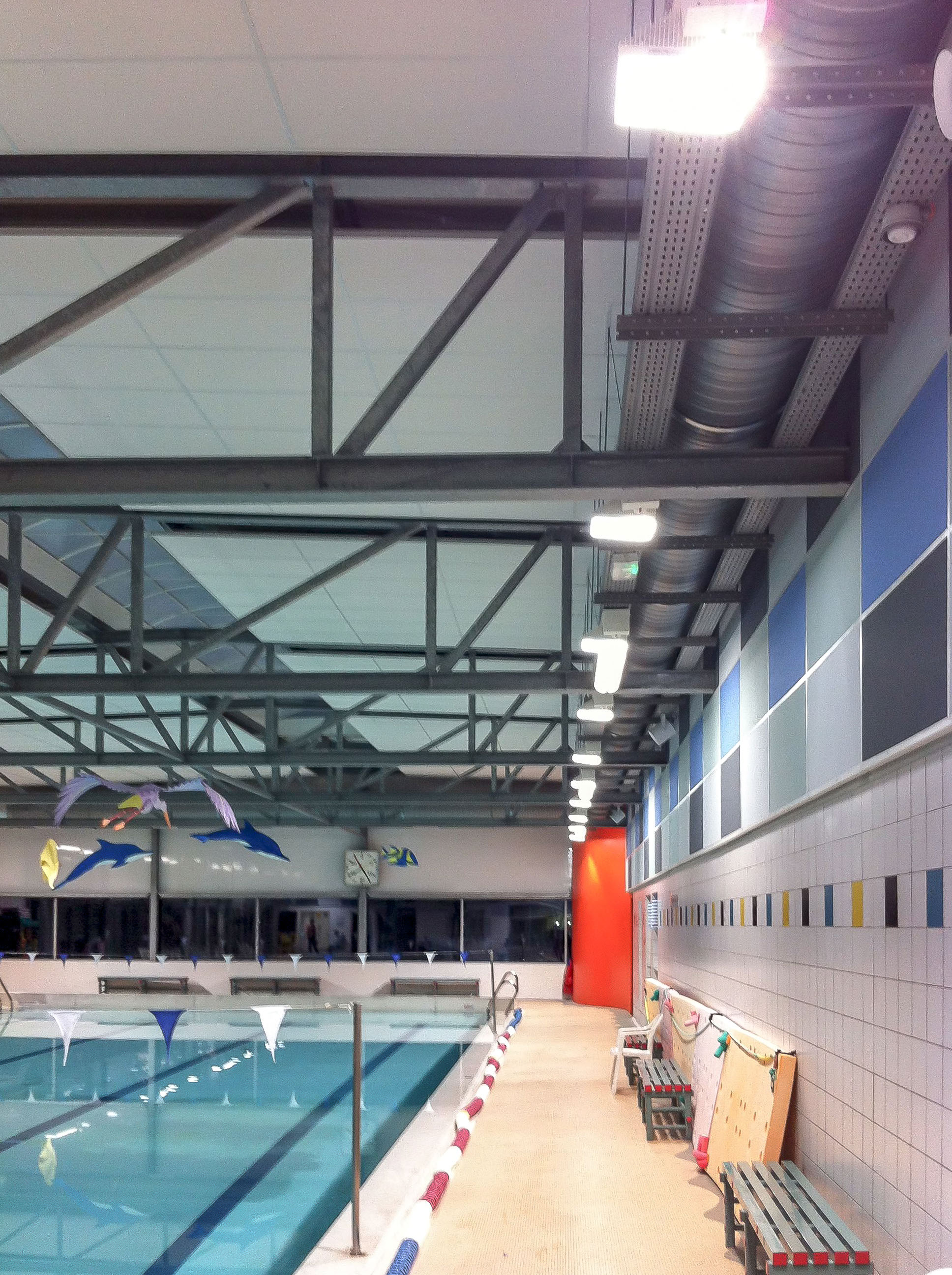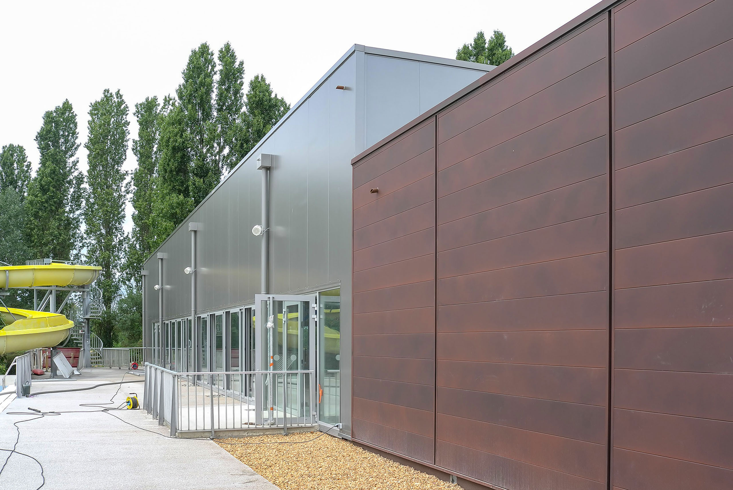 - le remplacement de toute l'enveloppe de la piscine (remplacement des bardages bois par des bardages métal, de la toiture et de toutes les menuiseries).