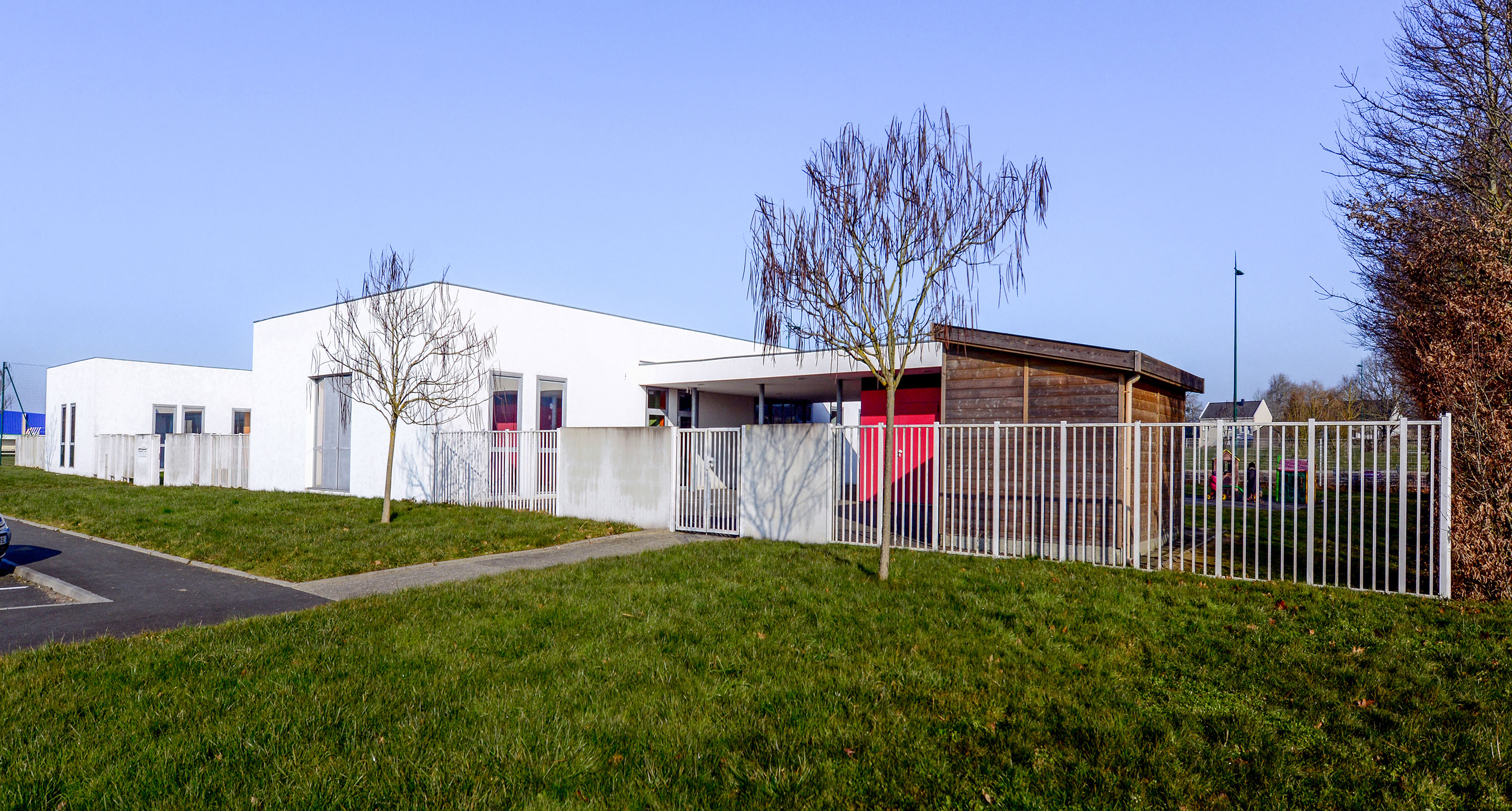 Sur ce terrain d’aspect très rural, en bordure du terrain de football et en face de l’école publique, nous prenons le parti architectural de créer un front bâti sur rue pour donner à cette dernière une consistance plus urbaine.
