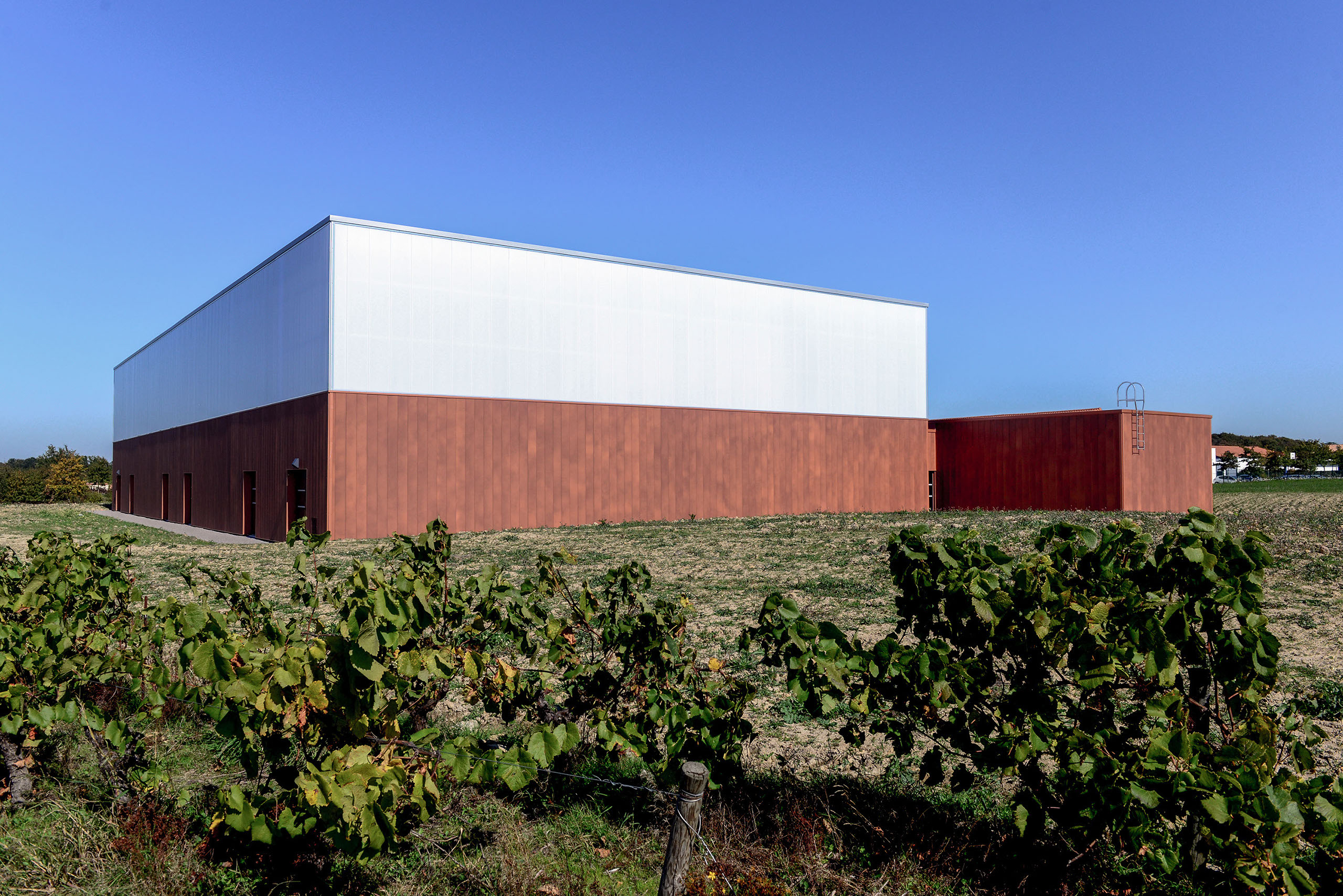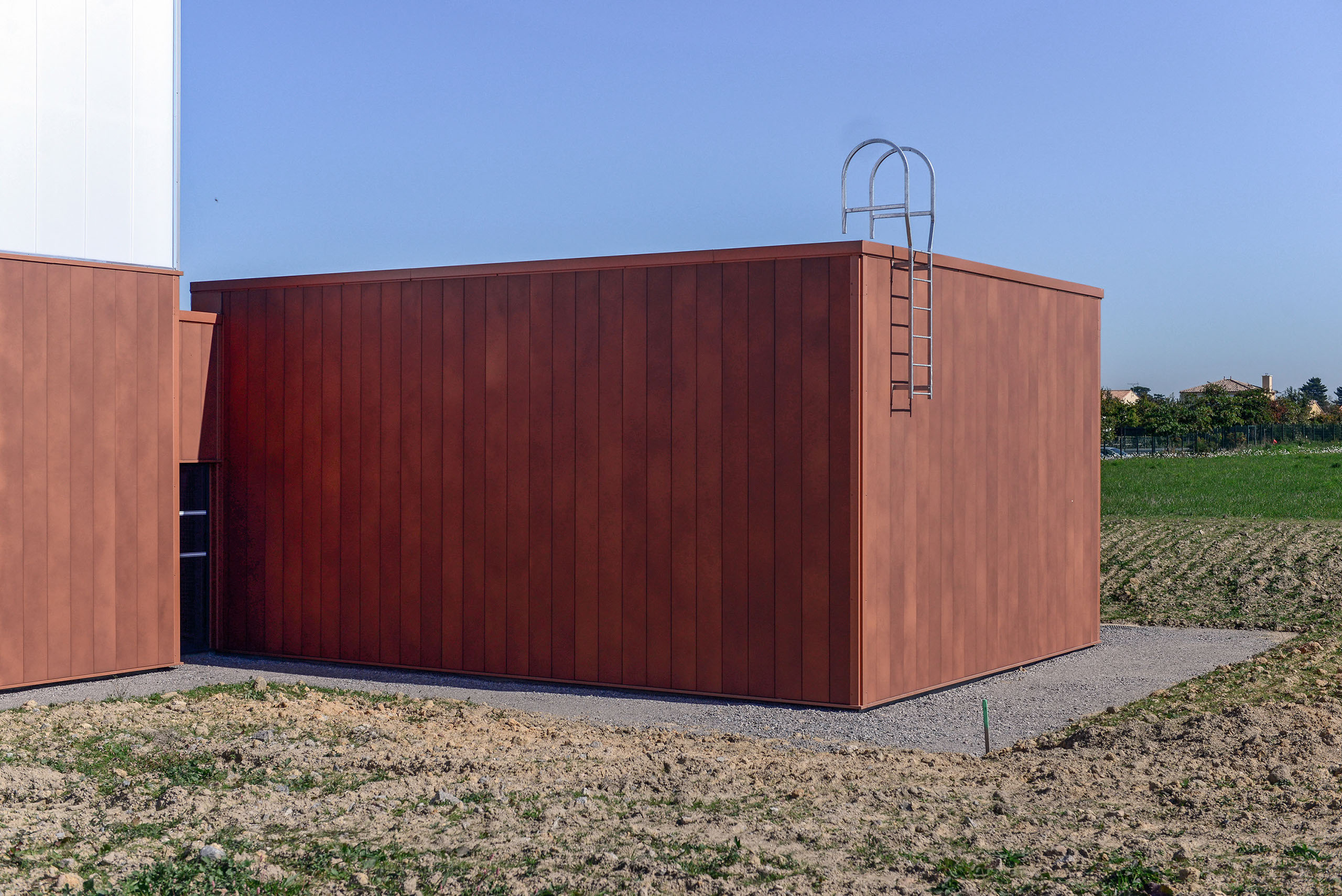 Le volume principal est un parallélépipède rectangle, composé d’une partie basse en bardage métal de teinte rouille rappelant le bois et d’une partie haute en bardage polycarbonate alvéolaire, apportant une lumière naturelle tamisée.