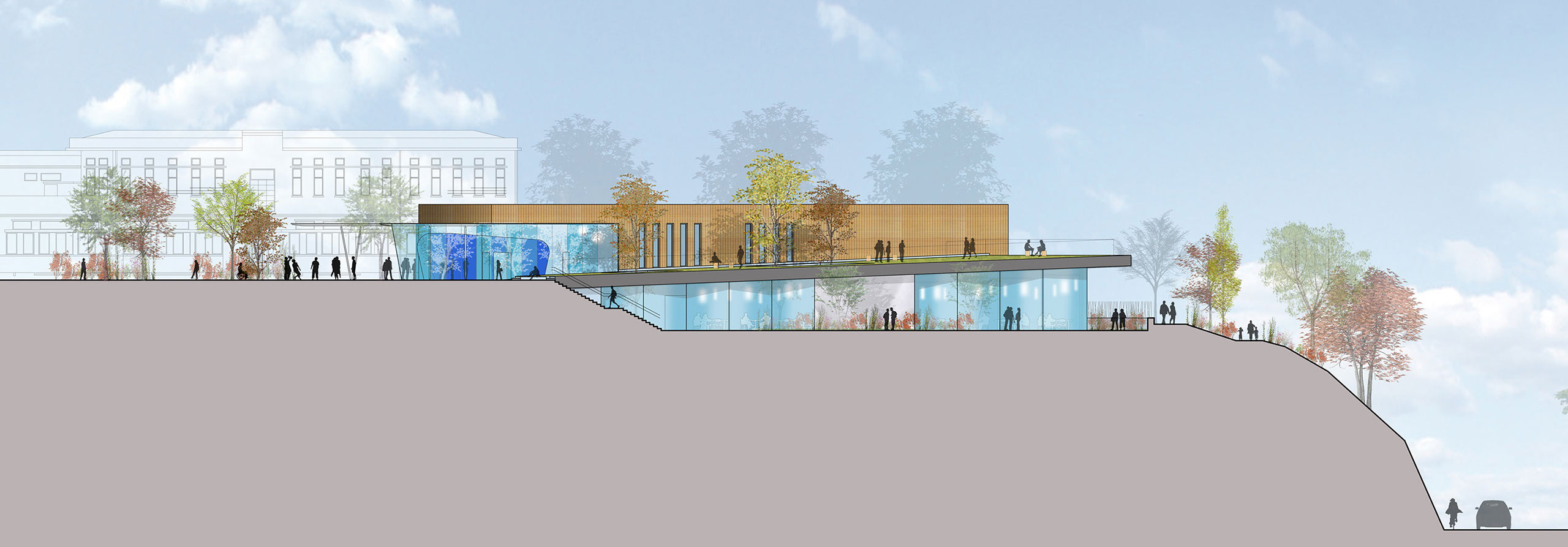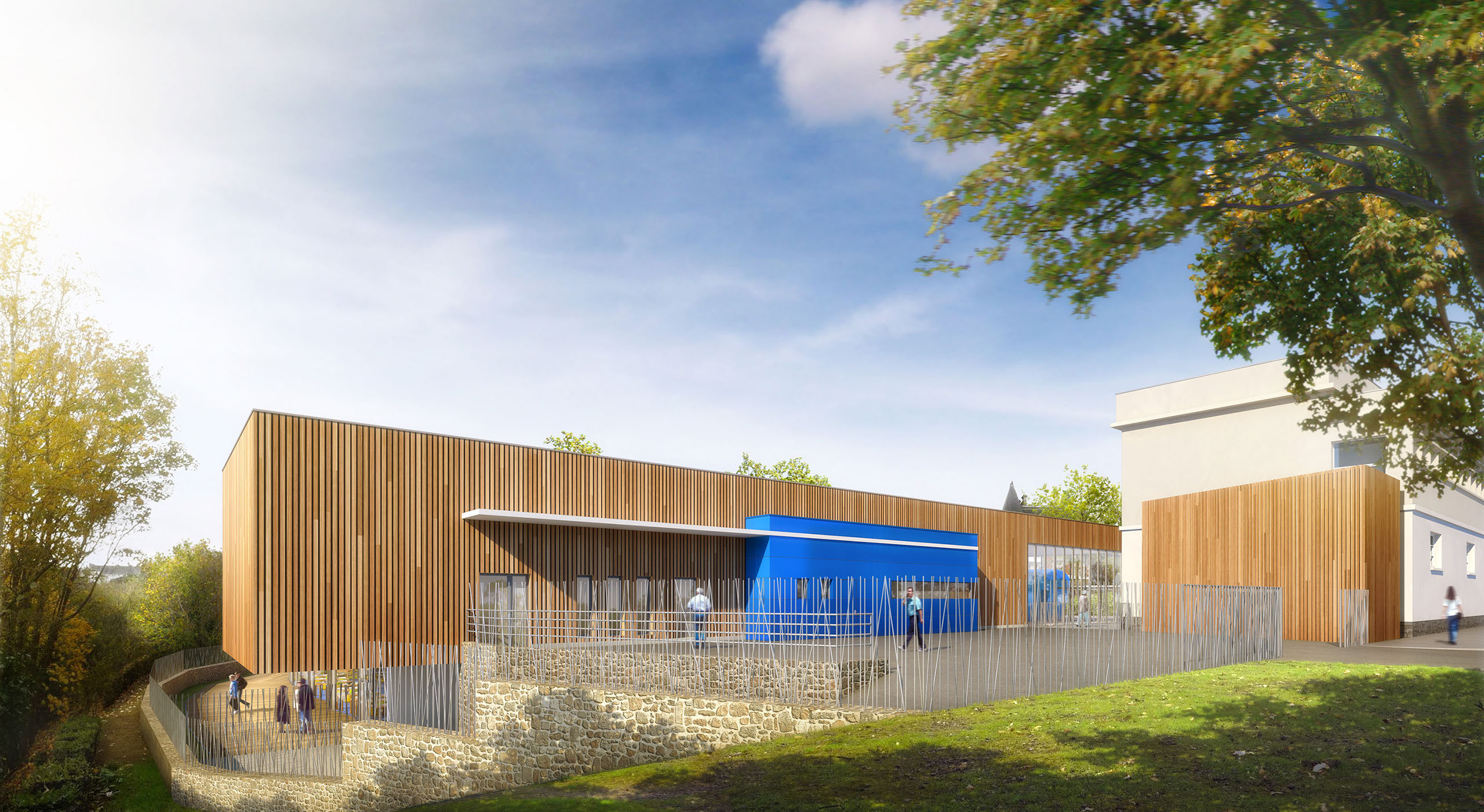 Nous avons alors poussés la réflexion jusqu’au bout et décidé d’effacer au maximum notre architecture au profit du site en enterrant le restaurant scolaire.