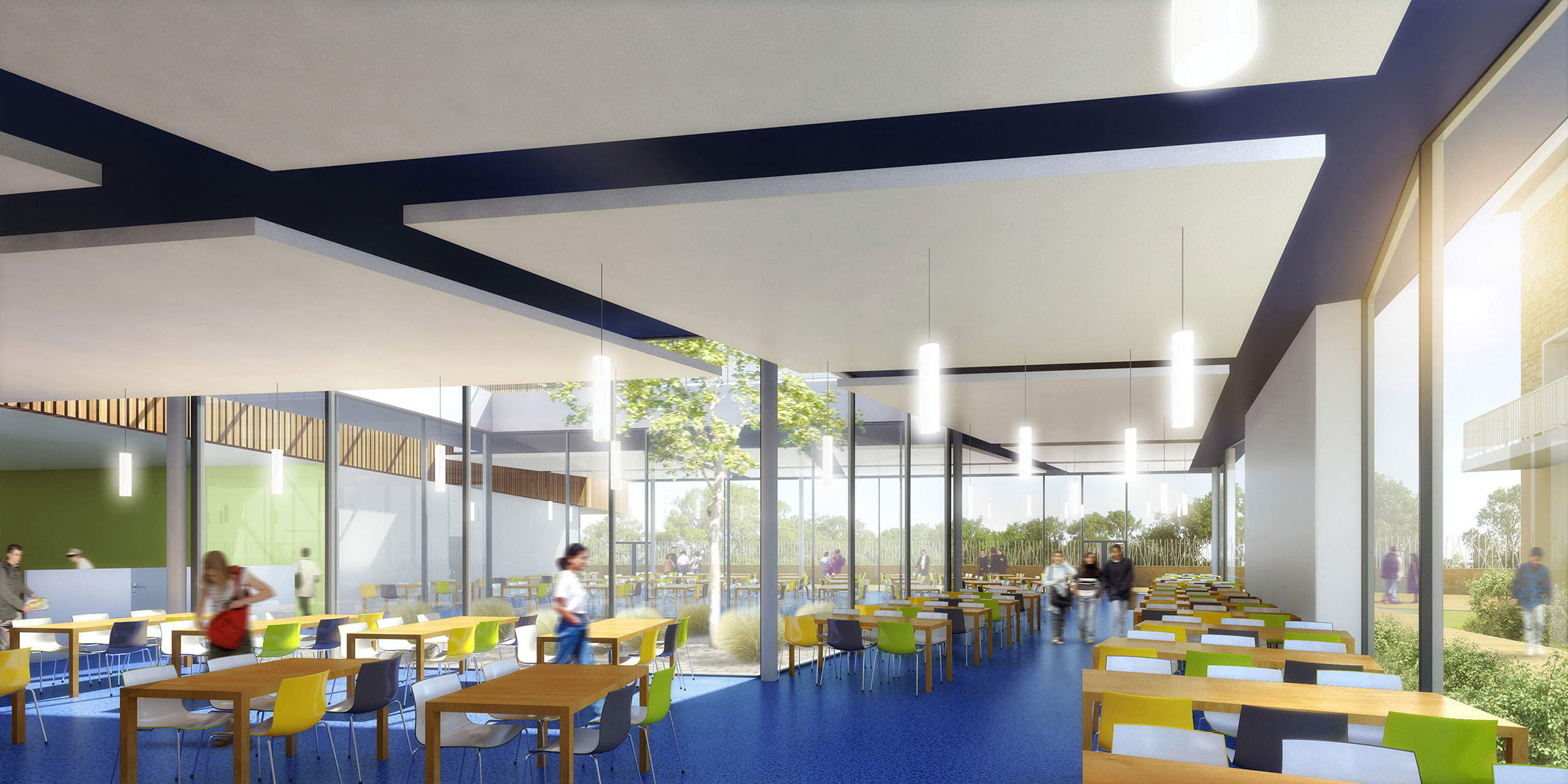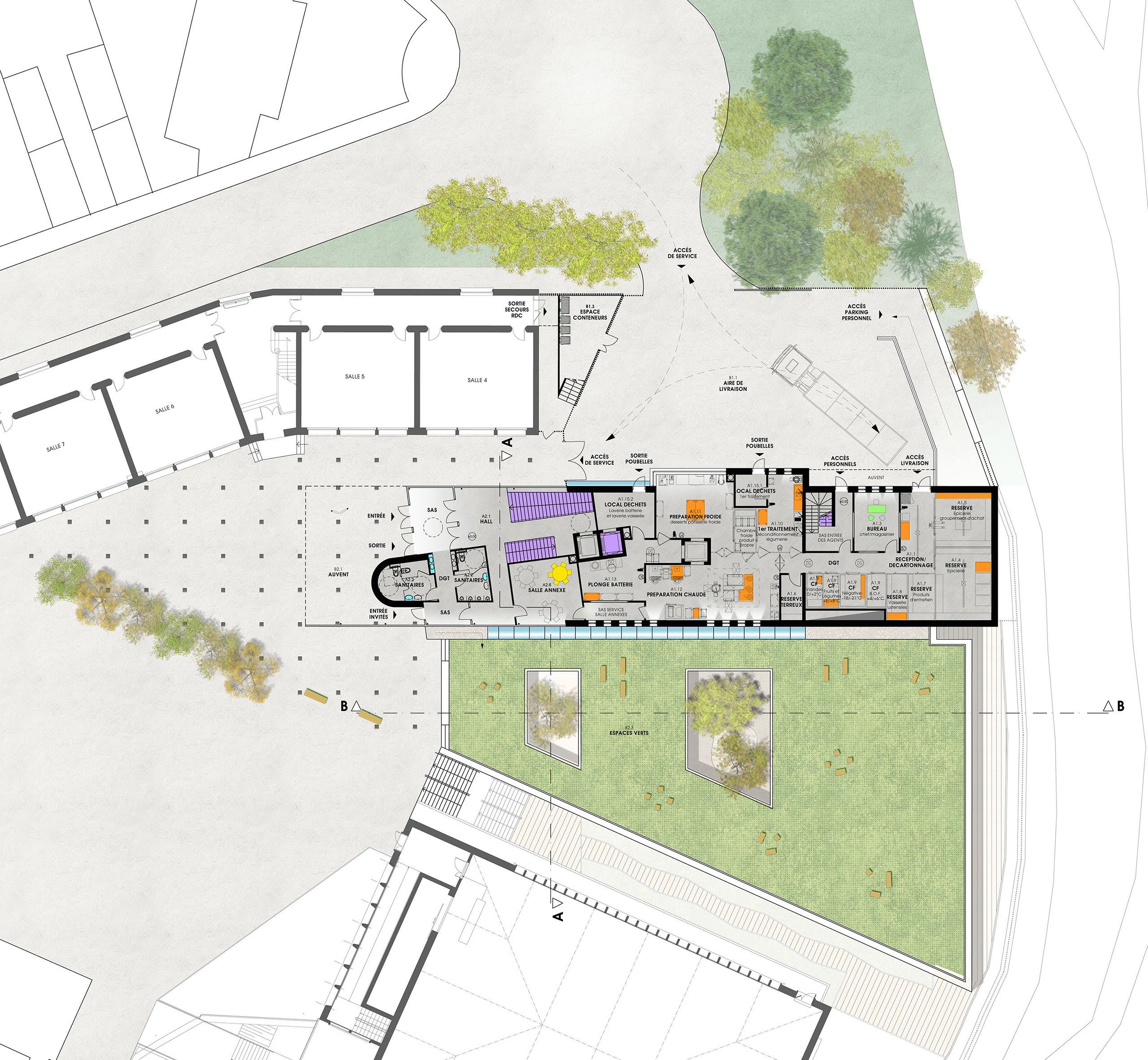 L’architecture rationnaliste et imposante du Lycée vient s’adoucir au contact des espaces arborés situés à proximité. Comment conserver un maximum d’espace végétalisé, ne pas donner l’impression de fermer l’espace de la cour, valoriser la vue imprenable sur la vallée, profiter du relief du terrain, toutes ces réflexions ont abouties au constat suivant : construire l’ensemble du restaurant de plain-pied n’est pas la bonne solution.